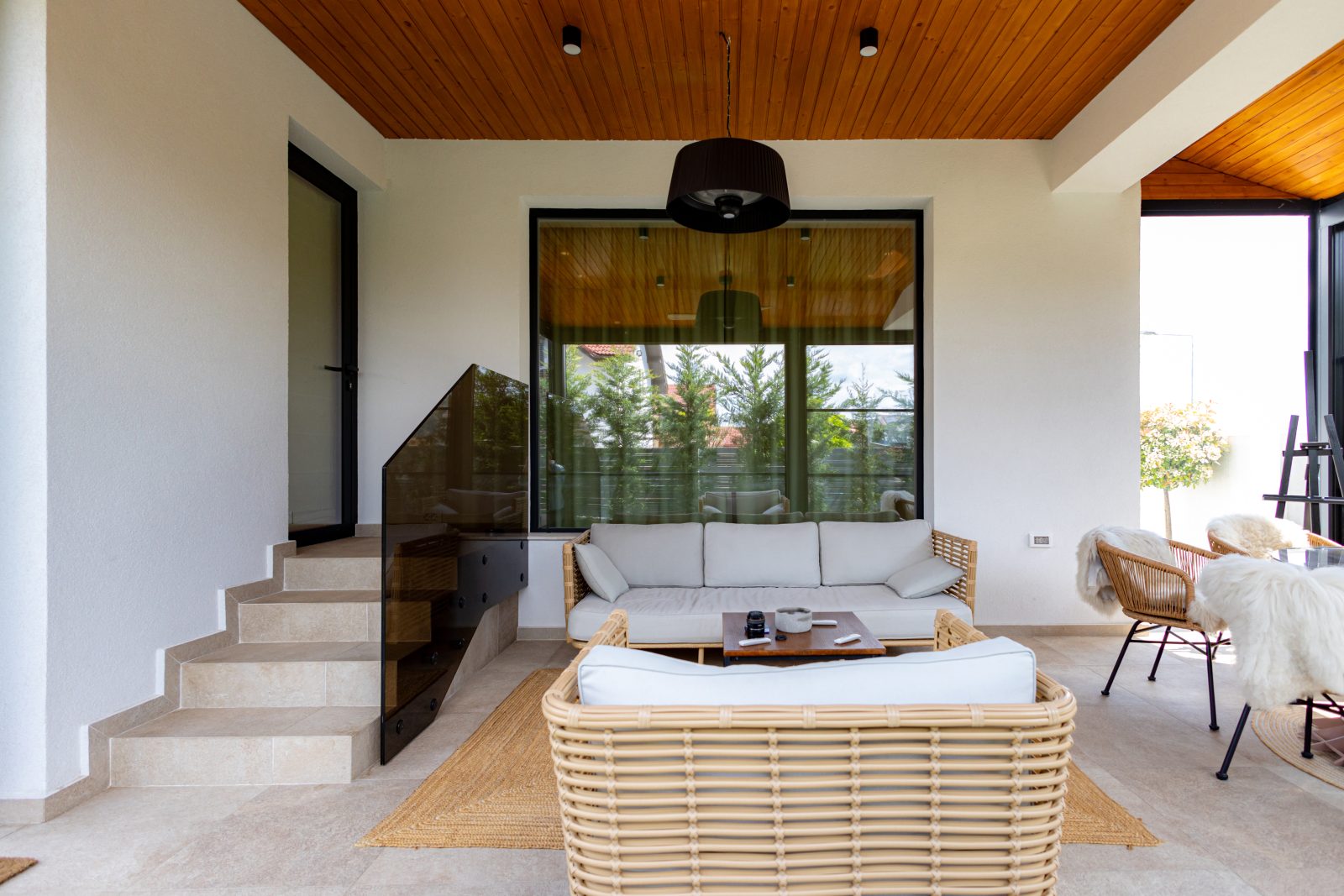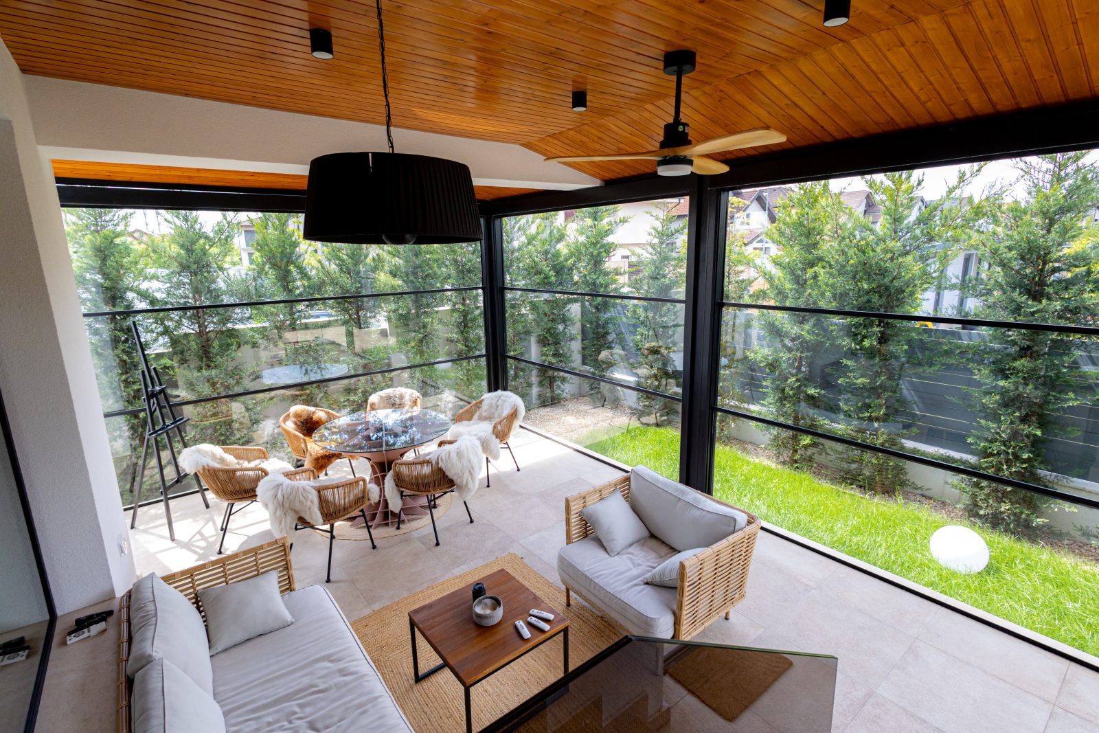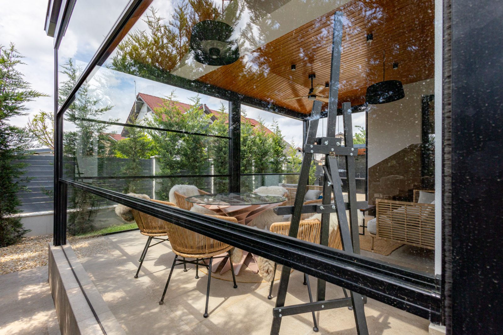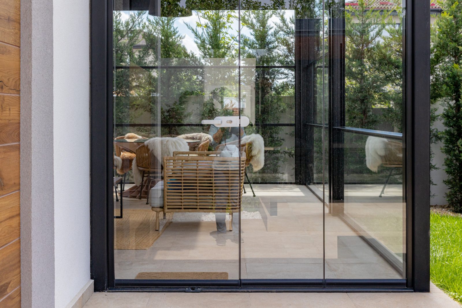 Terasa casei a fost echipată cu sisteme de închidere ghilotină DAKO VERTICAL SLIDE, care permit transformarea spațiului exterior într-o zonă confortabilă pe tot parcursul anului. Pentru accesul în curte, am utilizat sisteme de sticlă securizate armonice DAKO HARMONY GLASS, care oferă o deschidere generoasă și flexibilitate maximă. Această soluție inovatoare creează o conexiune armonioasă între interior și exterior, protejând în același timp împotriva intemperiilor.